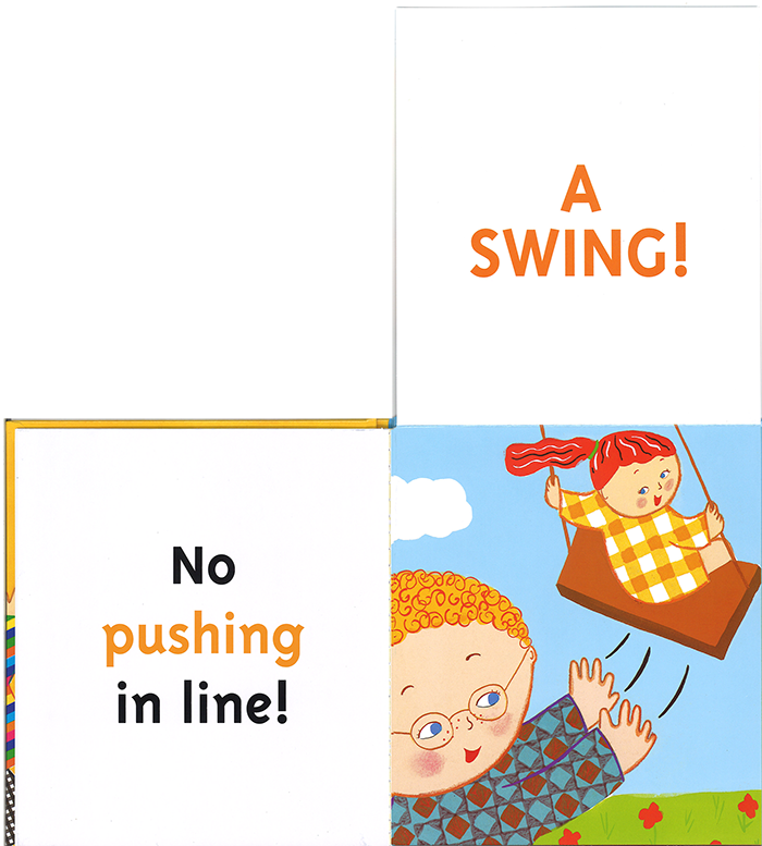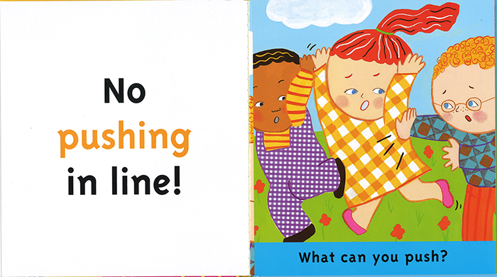 "WHAT CAN YOU BITE?""APPLES!"とひとつひとつ例を挙げて日常生活の中でのマナー、ルールを教えてくれます。