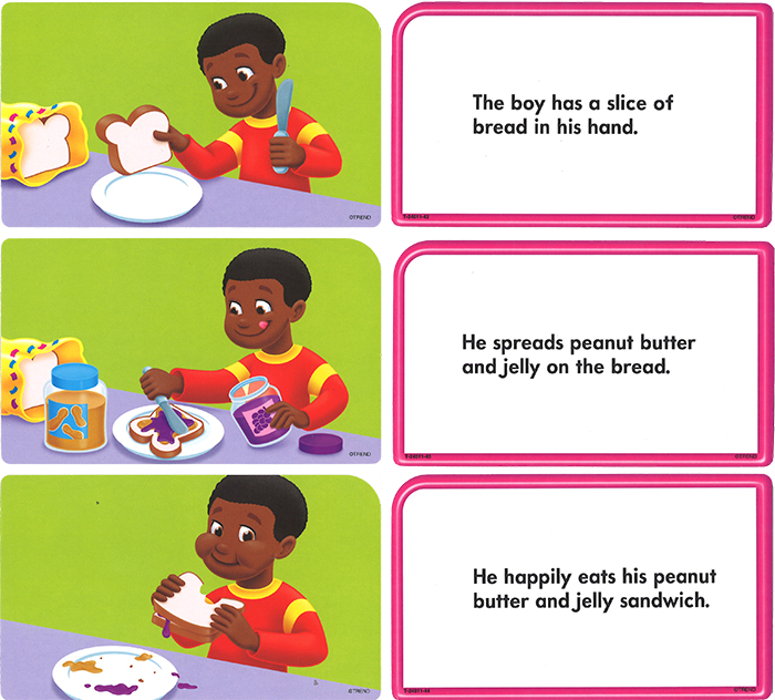 3枚のカードを正しく並べて、ひとつの場面を作ります。カード面はイラストのみ、裏面はセンテンスのみが印刷されています。イラストを見て文脈を推測する練習ができます。
