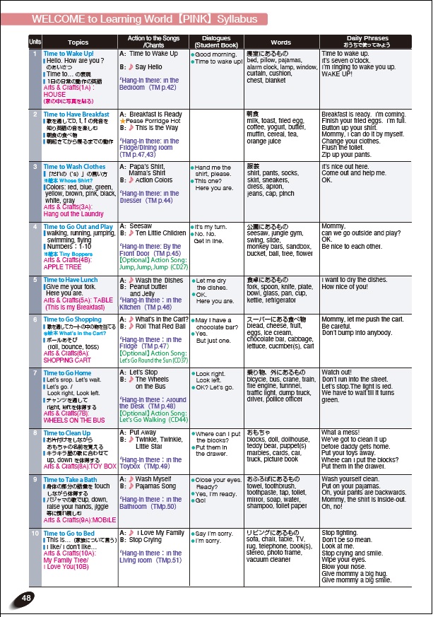 「朝起きて」から「おやすみ」までを10場面(10 Units)で展開。幼児の日常生活が英語のテキストに!朝ごはんのチャンツ、お買物ソング、洗濯物チャンツ、パジャマソング、ボール遊びの歌、キラキラ星、This is the Way等楽しいアクションソングがいっぱい!