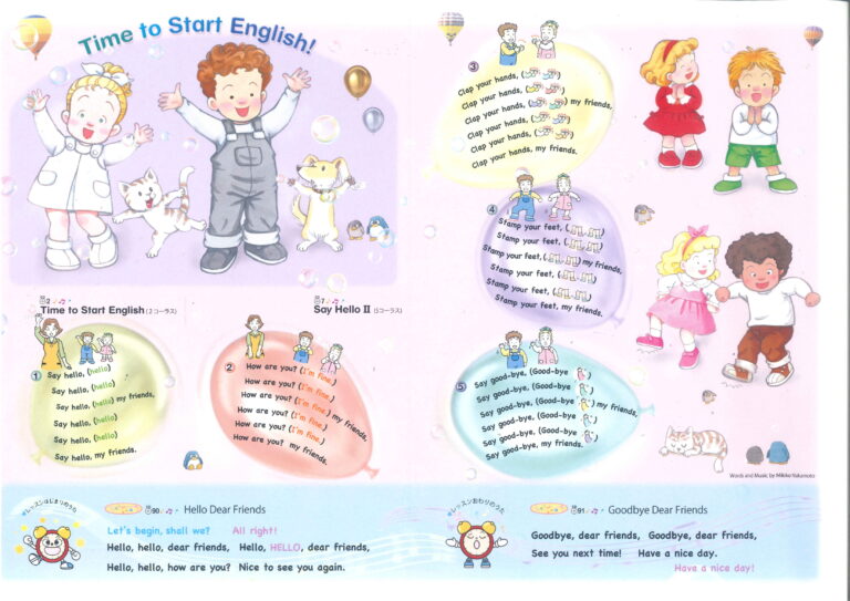 歌やチャンツを中心に身体を動かしながら、幼児の生活に身近な物の語彙・英語のフレーズに触れていきます。