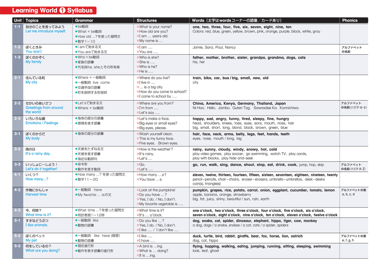 ※Learning World 1 で英語学習をスタートする場合、英語に慣れるため、WELCOME PINK, YELLOW,BLUEの歌、チャンツをWarm Up教材として最初の何か月かでインプットすることをおすすめします。