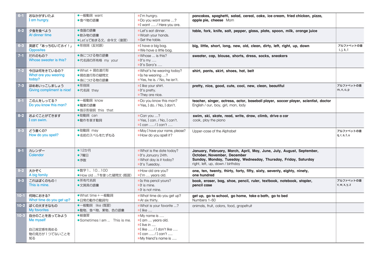 BOOK1では自己紹介、親子や友達との日常会話、服装、、職業、収穫への感謝、時計表現等を学びます。