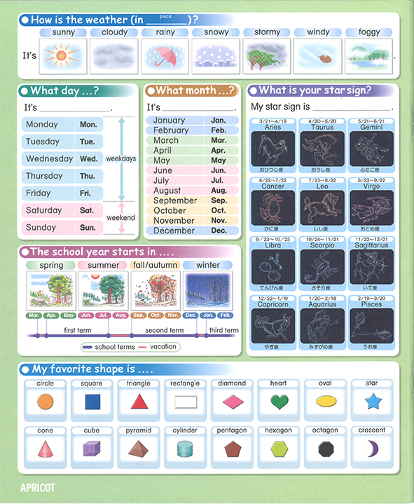 スペルがわからない生徒のために、天気、7曜日、12か月、四季に加えて、星座やいろいろな形の楽しい文字と絵が入っています。