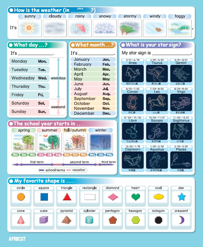 小学校3~5年用。「ヘボン式ローマ字」の表付き。(タテB5サイズ、ヨコA4サイズのワイド版) テキスト本文をコピー(テキストを見ながら写す)したり、アルファベットや語彙を書く練習にお使いください。 5冊入 ヨコ21cm×タテ25.7cm 48ページ ▼裏表紙 スペルがわからない生徒のために、天気、7曜日、12か月、四季に加えて、星座やいろいろな形の楽しい文字と絵が入っています。