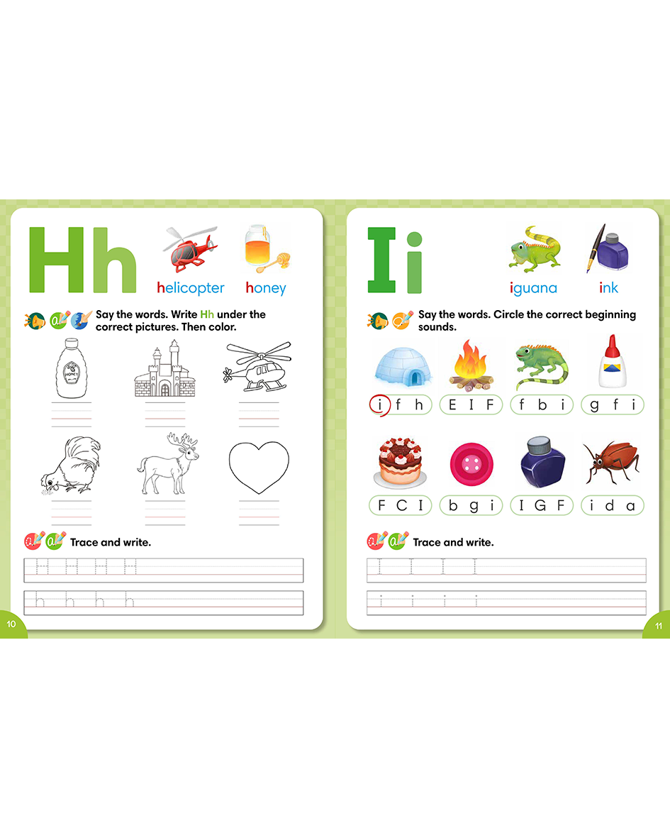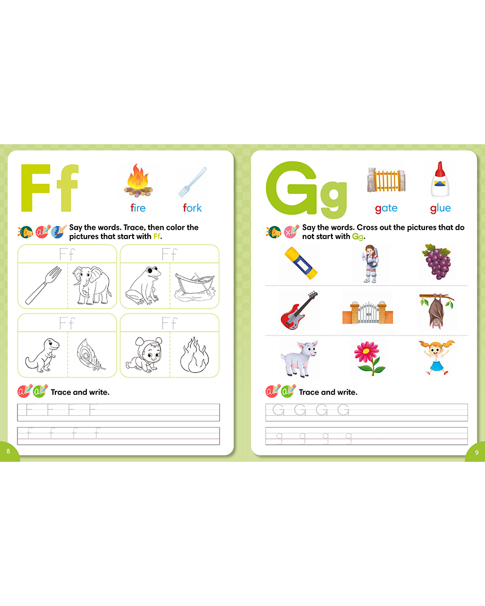 点線をなぞったり、丸をつけたり、色塗りしたり、様々な指示に従って反復練習ができるアルファベットに特化したワークブックシリーズです。