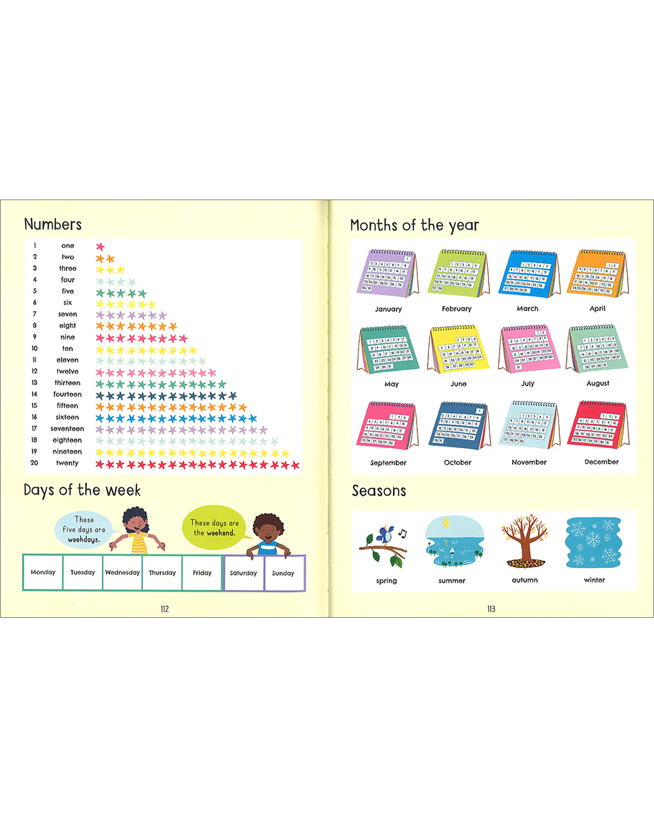 巻末には、数字や形、曜日や月、などよく使う単語をまとめて紹介しています。