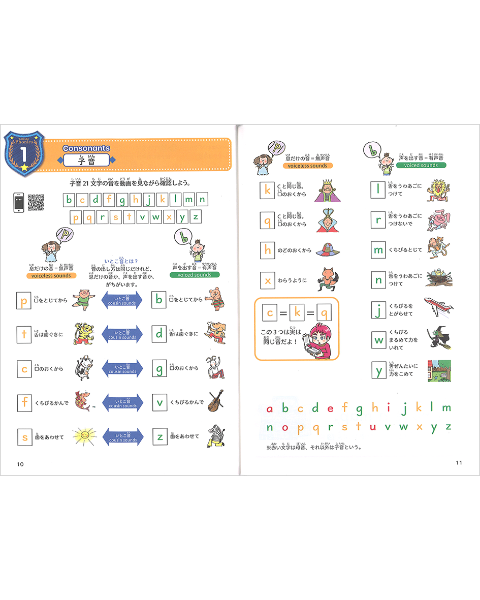 71のフォニックスルールを『イメージする→書き写す→覚える』のステップで学びます。単語レベルの読み書きにとどまらず、子どもの世界でよく使われるフレーズにも触れ、早い時期から文章にも慣れる工夫がされています。フォニックスだけにとどまらず、自己肯定感を同時に身に付けられる新しいスタイルのフォニックスのワークブック。